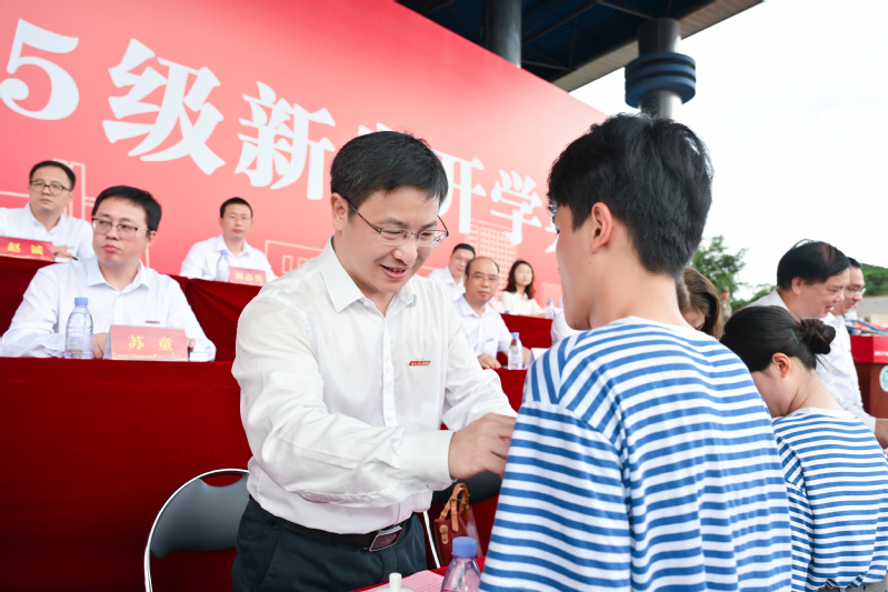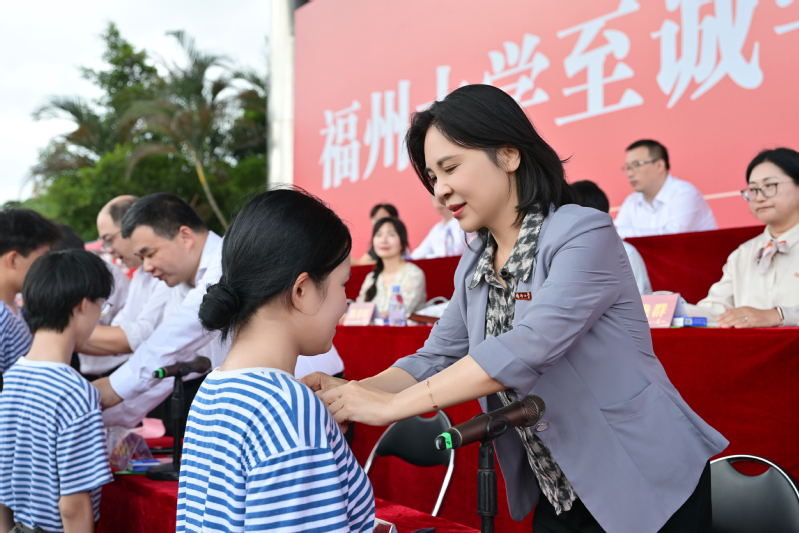 福州大学党委常委、副校长、至诚学院党委书记江莉龙为新生代表佩戴院徽
