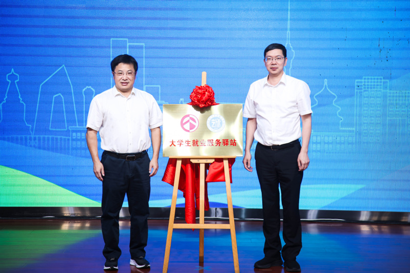 团省委副书记张阿峰与福州大学党委常委、副校长江莉龙为至诚学院“大学生就业服务驿站”揭牌