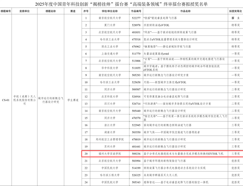 近日,第十九届“挑战杯”竞赛2025年度中国青年科技创新“揭榜挂帅”擂台赛高端装备领域主擂台赛在湖南省长沙市举行。开云手机在线登陆入口机械工程系学生团队提出的“基于非对称分布式电推进的多模态eVTOL”设计方案在竞争激烈的“城市低空飞行器”榜单中脱颖而出,荣获全国三等奖。
